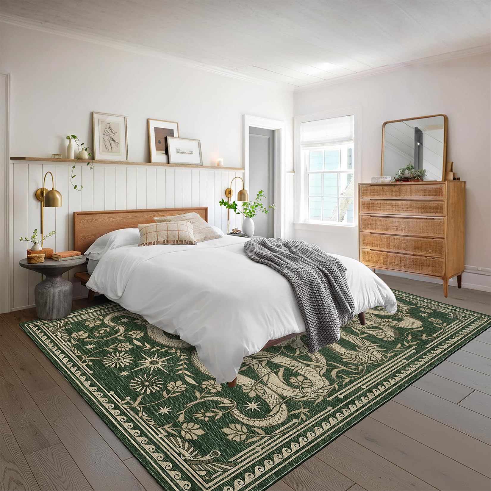 - Featuring bold and stylized snakes intertwining with intricate forest floral elements, this design is complemented by a simple yet elegant decorative border. Variants of beiges ,green, and golds stand out beautifully against a deep black charcoal ground, creating a striking contrast. Water-resistant, stain-resistant, and machine-washable. Rug colors may vary slightly according to your device and the lighting in your space
