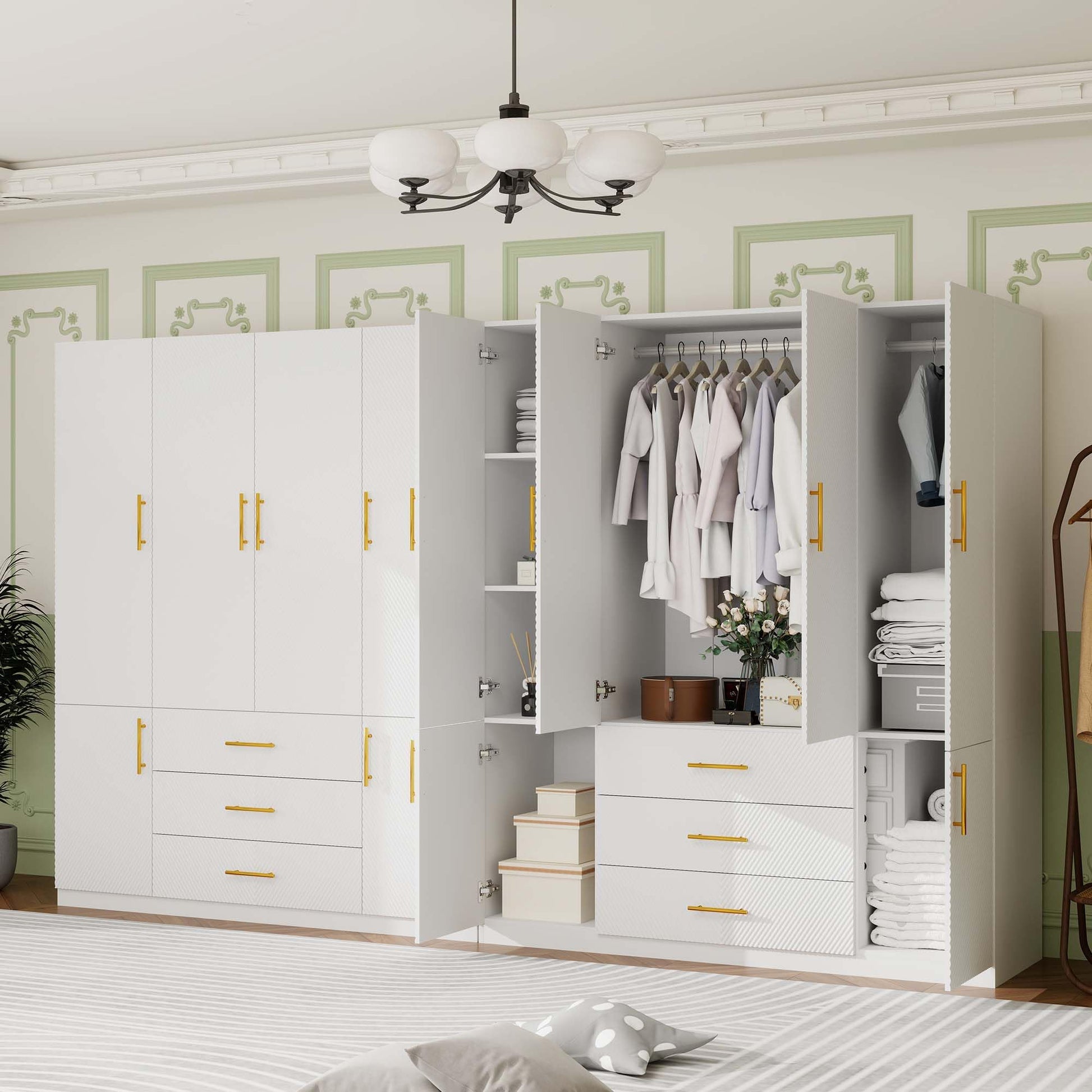 - Scientific partitioning, more efficient storage The wardrobe closet with doors interior is reasonably designed, the clothes rail is suitable for hanging wrinkled clothes, and the white wardrobe multi-layer shelves are convenient for classified storage, such as seasonal clothes, blankets, etc., helping you easily create an orderly storage space