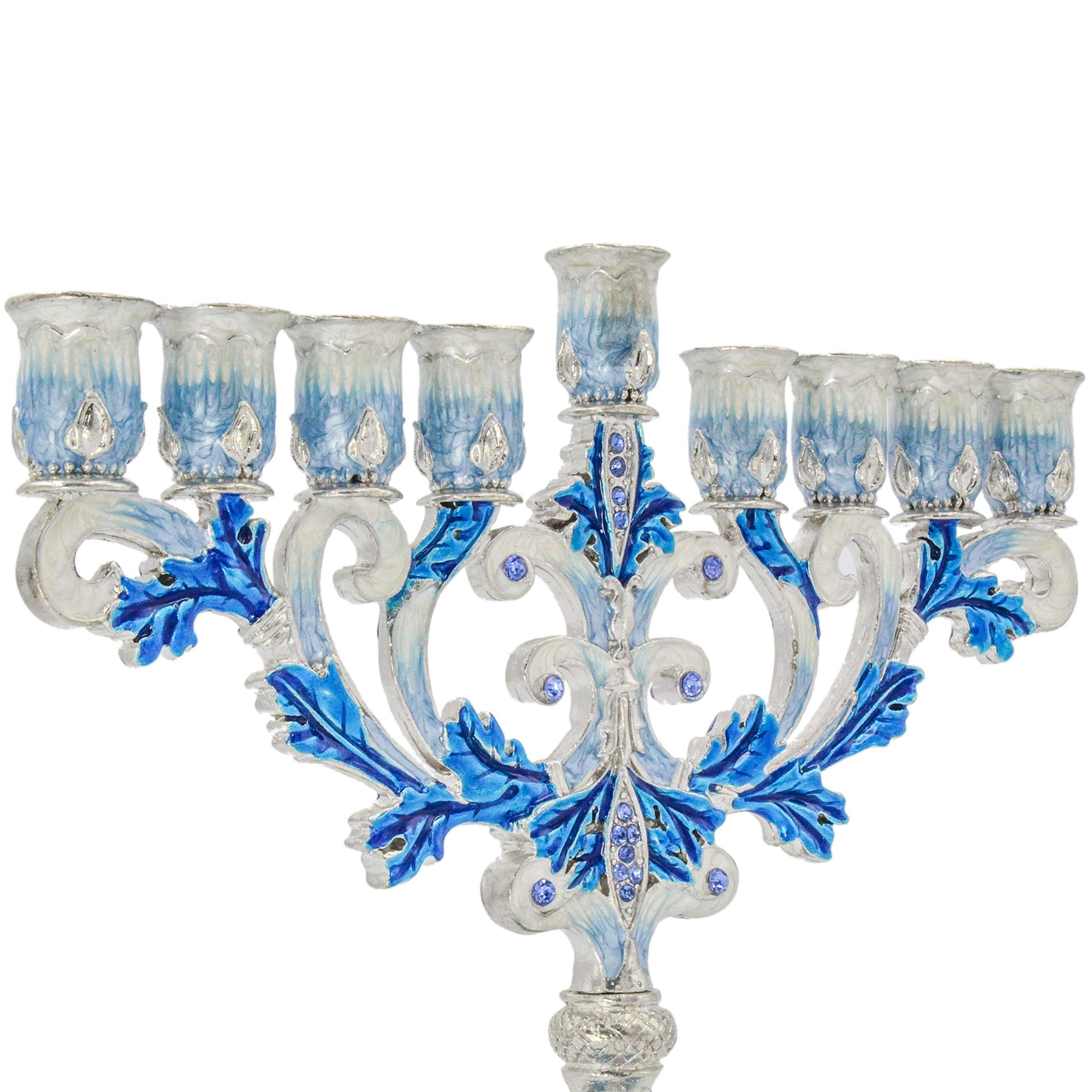 - Brightly Painted In Enamels And Highlighted With Beautiful Leaves Inlaid With Blue Gem Cut Crystals, This Ornate Menorah Measures 6.25” H X 6.5” W. For Your Home Or As A Gift, This Menorah Adds Dazzle To The Hanukkah Celebration