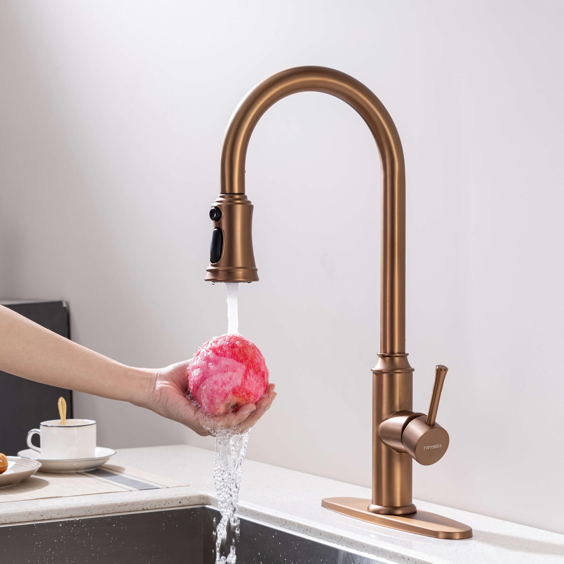 - High-arc kitchen faucet with pull down sprayer in rose golden finish, this faucet seamlessly blends modern convenience with timeless elegance, making it a stunning centerpiece for your kitchen renovation