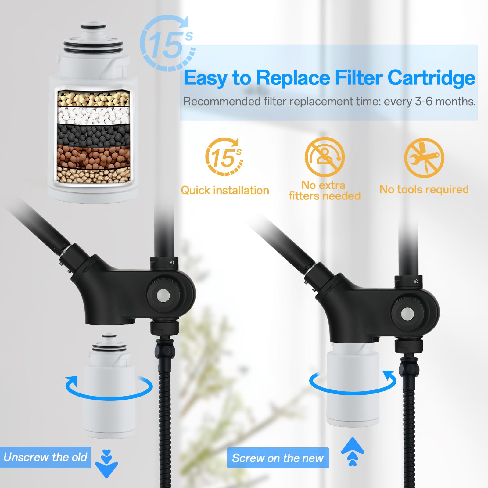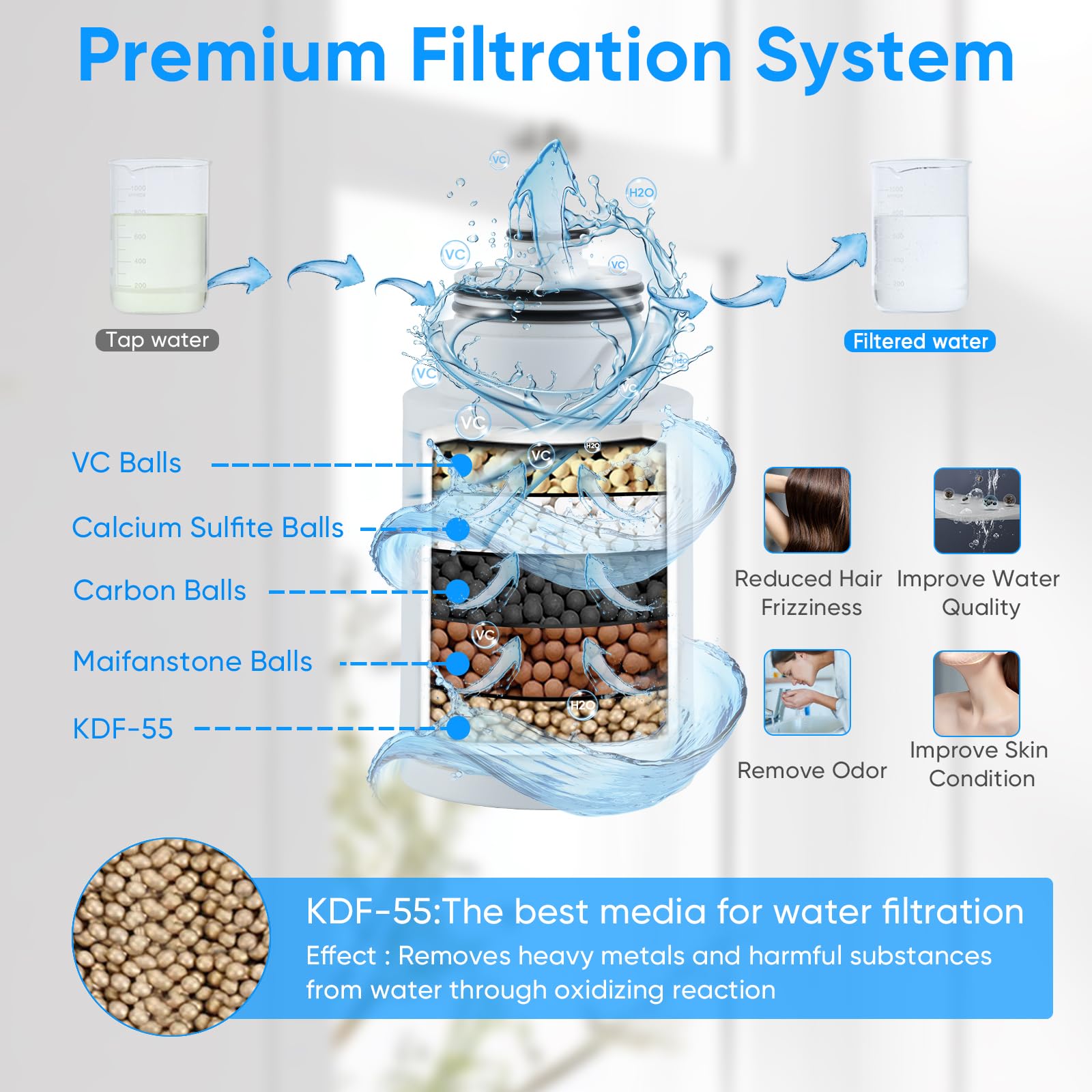 - 【High Quality Filtered Shower Head Configuration】: The filter can be easily removed and replaced. With superior KDF-55,Calcium Sulfite Balls, VC Balls,Maifanstone,Carbon Balls.Release more beneficial elements can effectively filter impurities and eliminate other harmful substances such as residual chlorine, bacteria, heavy metal ions, etc.Allows you to enjoy cleaner and healthier water while enjoying a relaxing shower