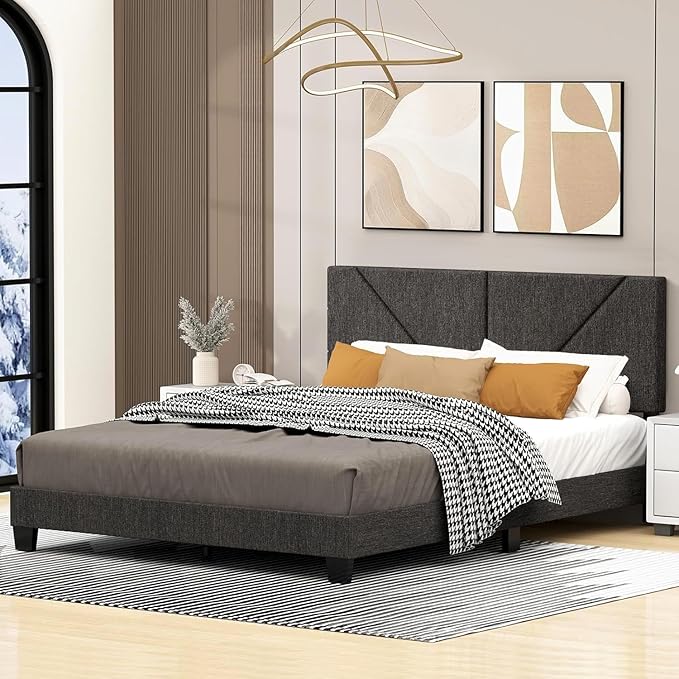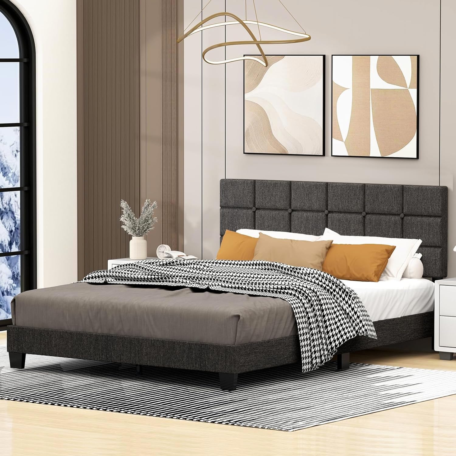 Queen Bed Frame with Headboard, Linen Upholstered Platform Bed Frame