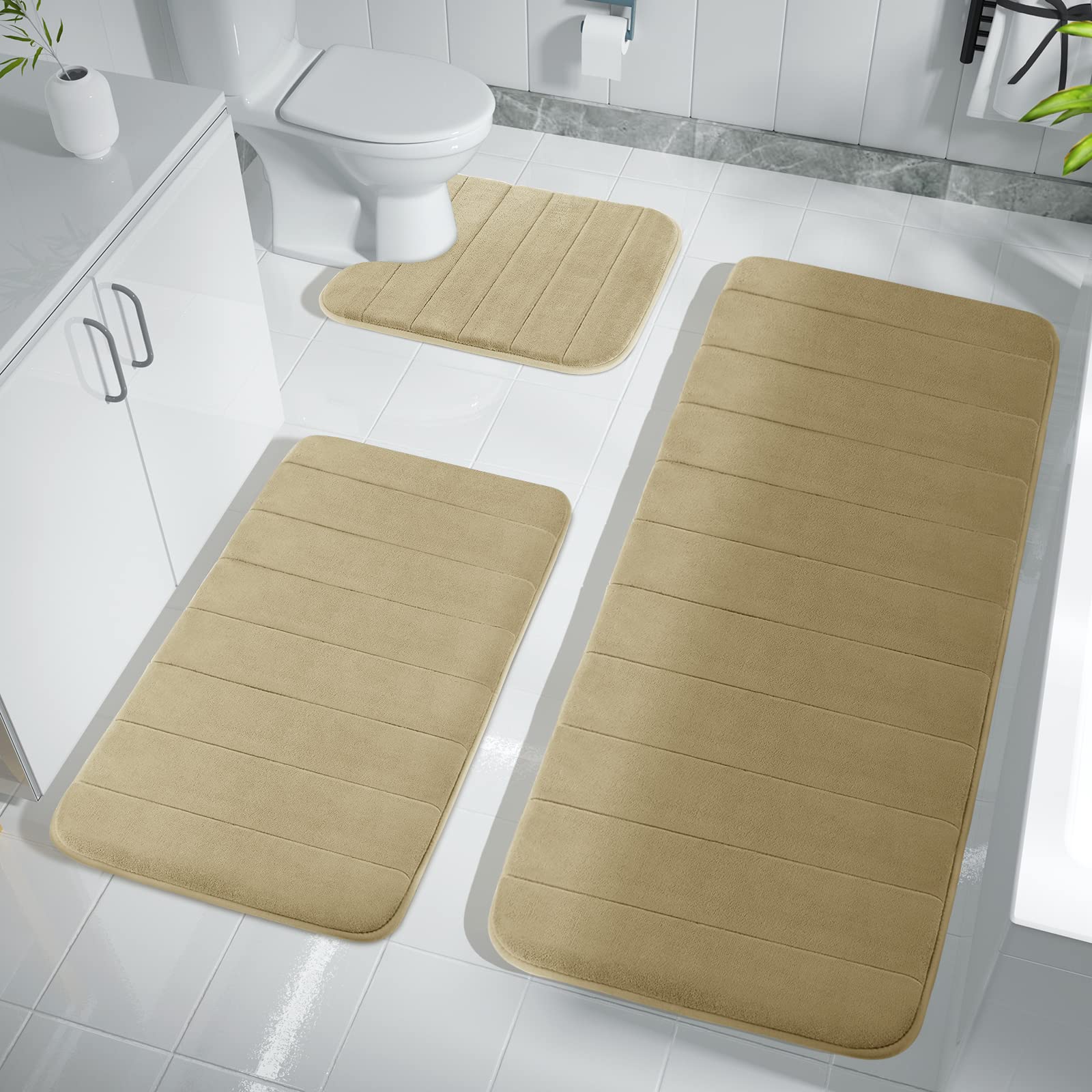 - STRONG ANTI SLIP BACKING: Yimobra memory foam bathmat is backed with PVC dots prevent shifting and skidding. Bathroom rug set extricate your feet from cold floors while protecting your floor from moisture. And high-quality substrate is made of non-toxic, non-slip, material protect your family, especially great for kids and the old (notes: please check the floor where you lay the mat on is dry, no oil stains and no textured!)