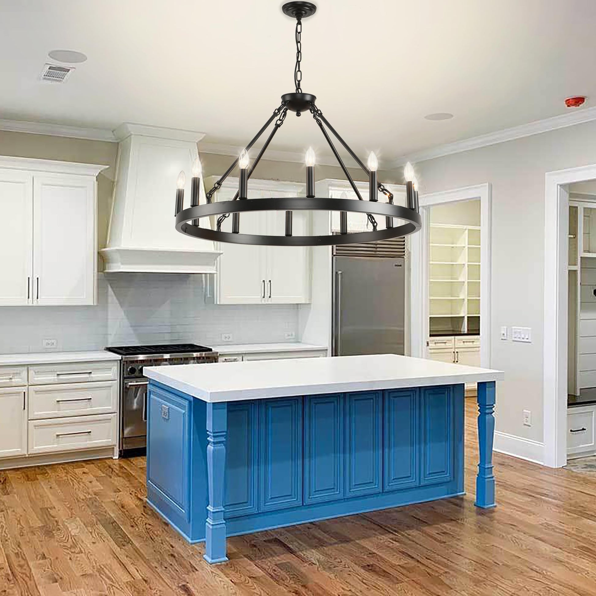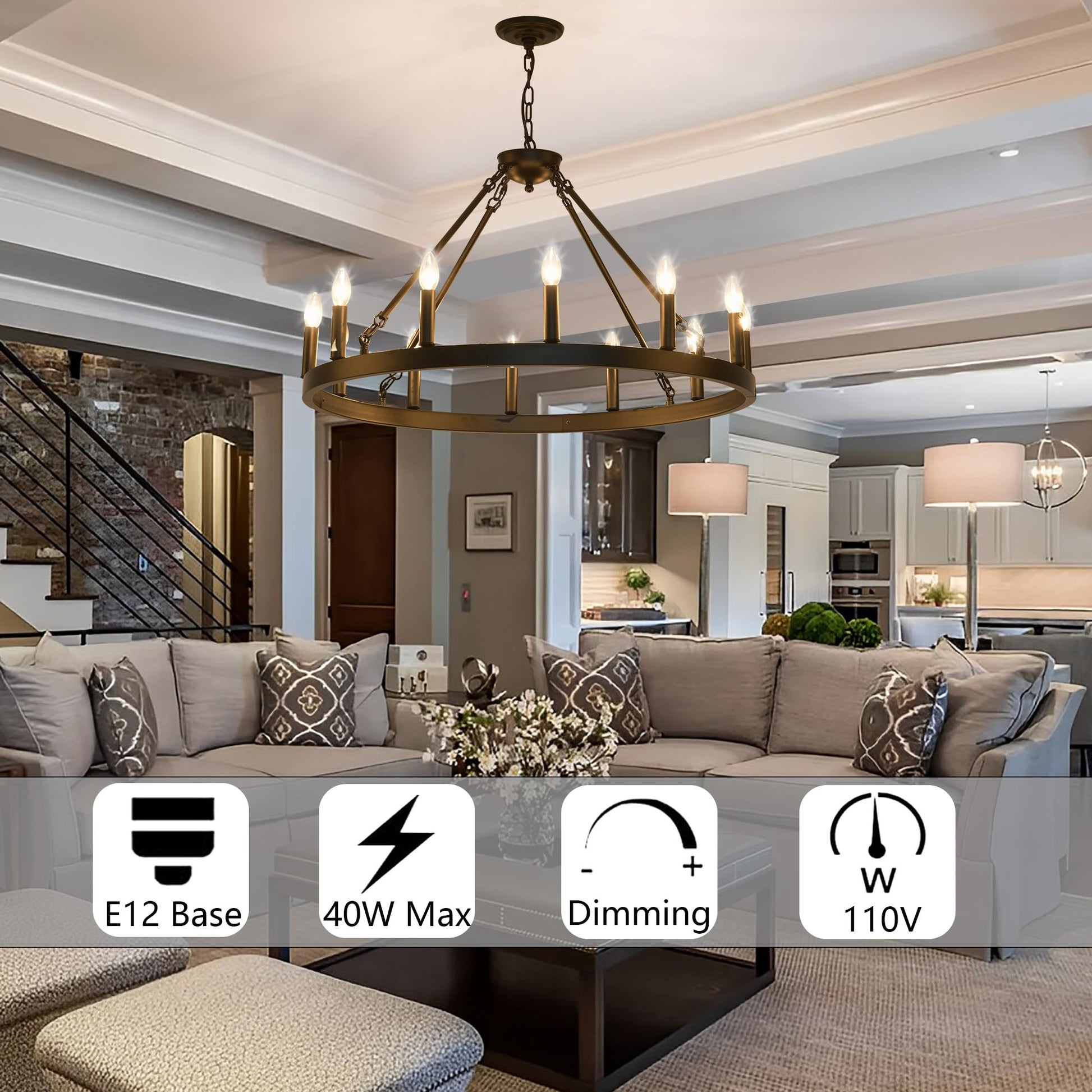 - The black wagon wheel chandelier was made by a skilled craftsman. The 12-light design provides 360°light coverage creating a vintage industrial style and a nostalgic style.If you use a bright bulb, it will illuminate a large space,creates a cozy home atmosphere.