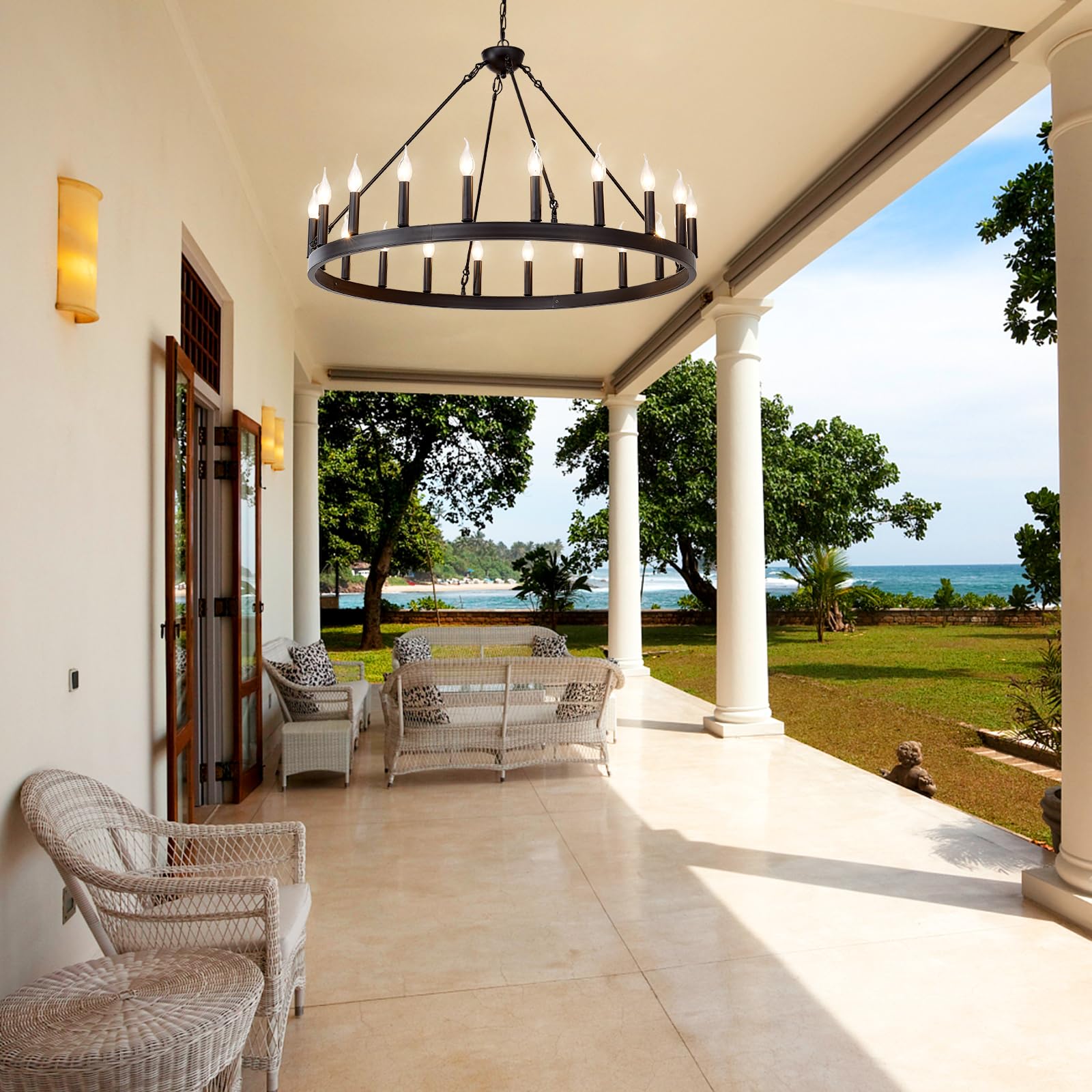 - The black wagon wheel chandelier was made by a skilled craftsman. The 20-light design provides 360°light coverage creating a vintage industrial style and a nostalgic style.If you use a bright bulb, it will illuminate a large space,creates a cozy home atmosphere.